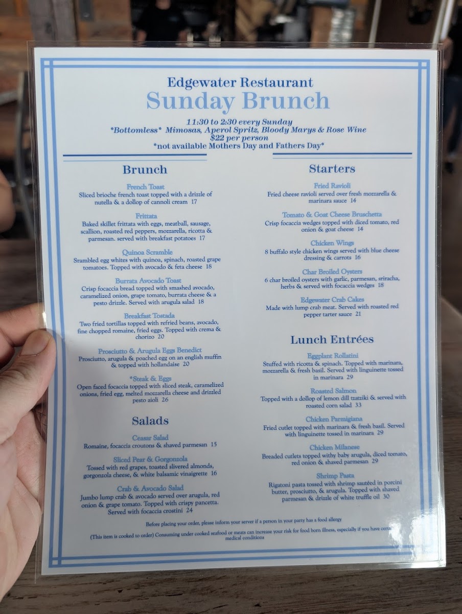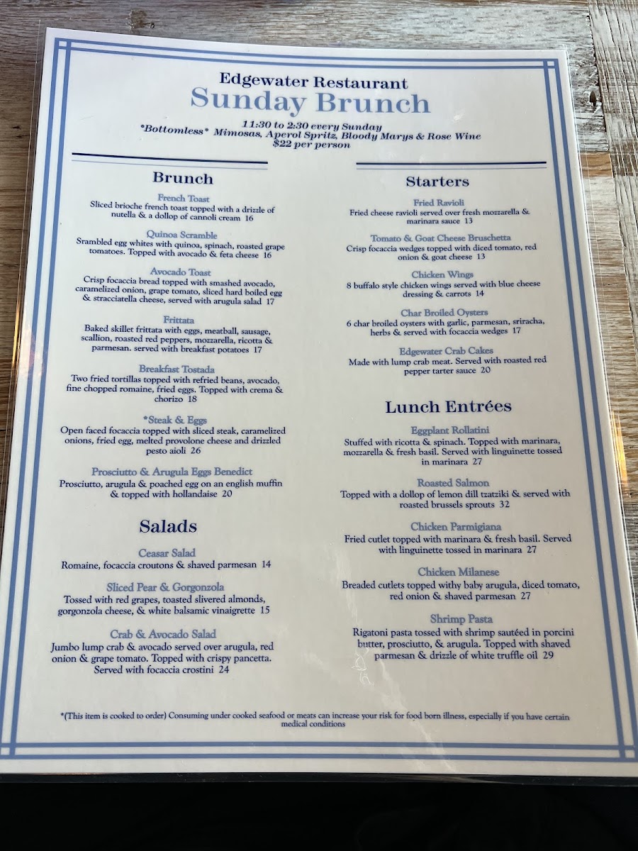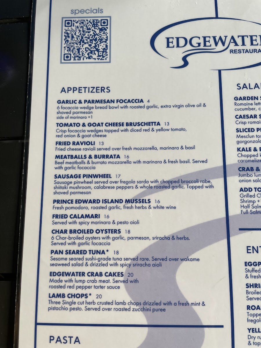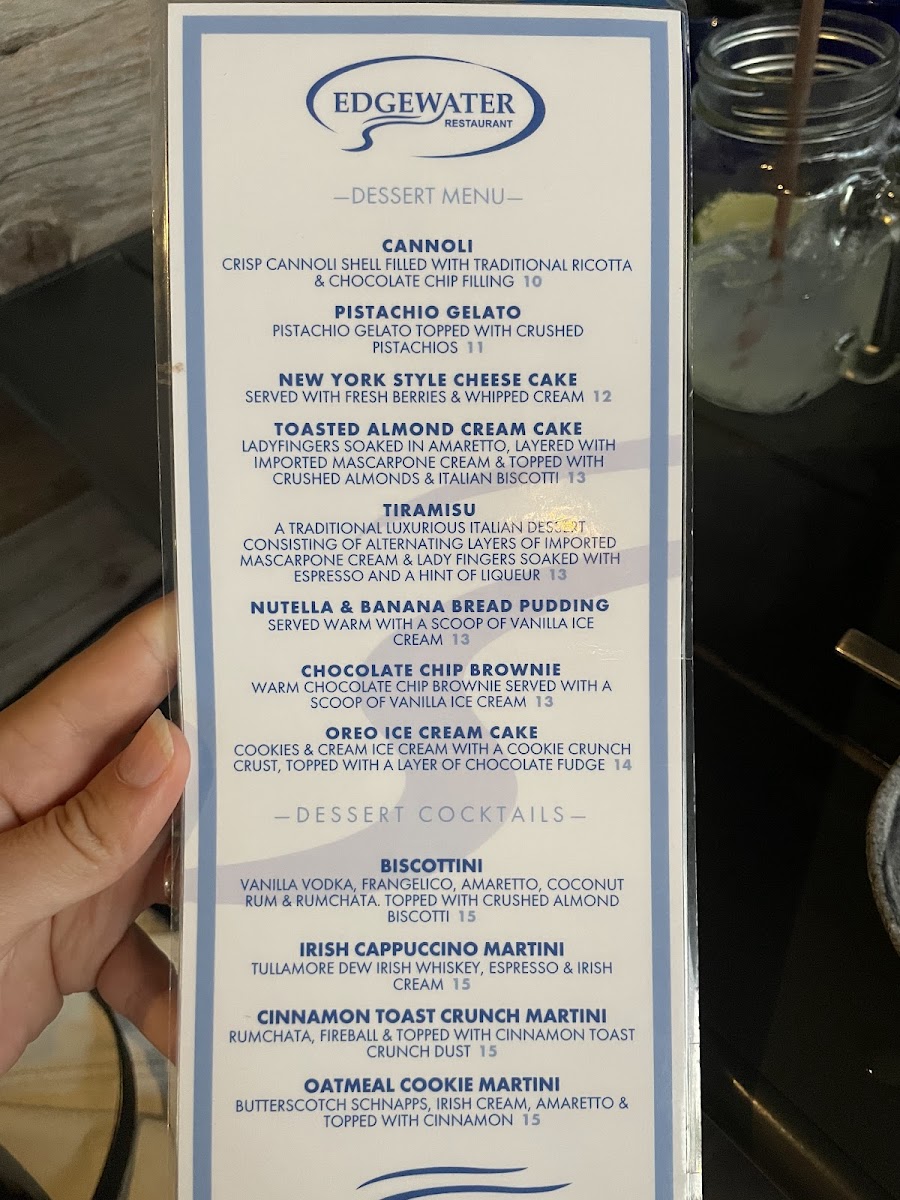 Perfect for a relaxed lunch, a sunset dinner, or a casual gathering with friends, the food at Edgewater complements the warm and inviting atmosphere. Lighter bites like Fried Calamari and Edgewater Crab Cakes make for great starters, while richer plates such as Filet Mignon paired with Shrimp and Mushroom offer a satisfying main course. For dessert, traditional Italian sweets like Tiramisu and Almond Cream Cake provide a smooth finish.